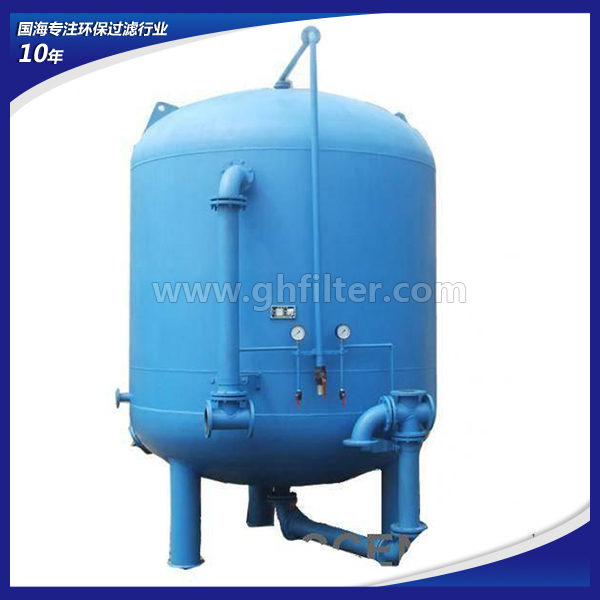 多介質(zhì)過濾器是以成層狀的無煙煤、砂、細碎的石榴石或其他材料為床層,床層的頂層由較輕和較粗品級的材料組成,而較重和較細品級的材料放在床的低部。其原理為按深度過濾--水中較大的顆粒在頂層被去除,較小的顆粒在過濾器介質(zhì)的較深處被去除。從而使水質(zhì)達到粗過濾后的標準。設(shè)備是壓力式的,其原理是當原水自上而下通過濾料時,水中懸浮物由于吸附和機械阻流作用被濾層表面截留下來;當水流進濾層中間時,由于濾料層中的砂粒排列的更緊密,使水中微粒有更多的機會與砂粒碰撞,于是水中凝絮物、懸浮物和砂粒表面相互粘附,水中雜質(zhì)截留在濾料層中,從而得到澄清的水質(zhì)