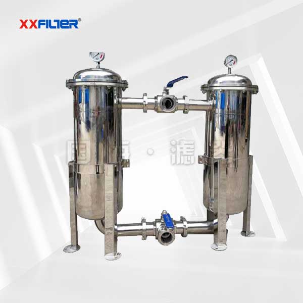 雙并聯(lián)切換袋式過(guò)濾器主要有兩個(gè)過(guò)濾筒體、過(guò)濾筒蓋和快開(kāi)機(jī)構(gòu)、不銹鋼濾袋加強(qiáng)網(wǎng)等主要部件組成,濾液由過(guò)濾器外殼的旁側(cè)入口管流入濾袋,濾袋本身是裝置在加強(qiáng)網(wǎng)籃內(nèi),液體滲透過(guò)所需要細(xì)度等級(jí)的濾袋即能獲得合格的濾液,雜質(zhì)顆粒被濾袋攔截。該機(jī)更換濾袋十分方便,過(guò)濾基本無(wú)物料消耗。雙并聯(lián)切換袋式過(guò)濾器全部采用不銹鋼制造,是二個(gè)柱體組成,系單層不銹鋼焊接結(jié)構(gòu),內(nèi)外表面拋光,頂部裝有放氣閥,以便工作時(shí)放氣之用。管道接頭采用脹合連接,經(jīng)0.3Mpa水壓試驗(yàn),三通外螺紋旋塞啟閉靈活,該設(shè)備結(jié)構(gòu)緊湊,操作方便,維修簡(jiǎn)單。雙聯(lián)過(guò)濾器又稱并聯(lián)切換過(guò)濾器,采用兩個(gè)三通球閥,將兩個(gè)單筒過(guò)濾器組裝在一個(gè)機(jī)座上,清洗過(guò)濾器時(shí)不必停車,保證其連續(xù)工作,是不停車生產(chǎn)線過(guò)濾裝置首選,本過(guò)濾器的過(guò)濾元件,除采用不銹鋼濾芯外,亦可采有優(yōu)質(zhì)蜂房式脫脂纖維棉,可濾掉粒徑1μ以上的顆粒,本過(guò)濾器亦可單筒使用,此時(shí)只需去掉共同機(jī)座,其余尺寸不變。雙聯(lián)過(guò)濾器內(nèi)外表面拋光處理,濾筒內(nèi)裝有不銹鋼濾網(wǎng)和濾網(wǎng)支撐籃;頂部裝有放氣閥,供過(guò)濾時(shí)排放濾器內(nèi)空氣作用。上蓋與濾筒連接采用快開(kāi)式結(jié)構(gòu),更方便清洗(更換)濾網(wǎng),三只可調(diào)節(jié)式支腳可使濾器平穩(wěn)放置在地面上。連接管路采用活接或卡箍連接方式,進(jìn)出料閥門采用三通球閥啟閉,耐壓耐溫,操作靈活方便,無(wú)料液泄漏更衛(wèi)生。